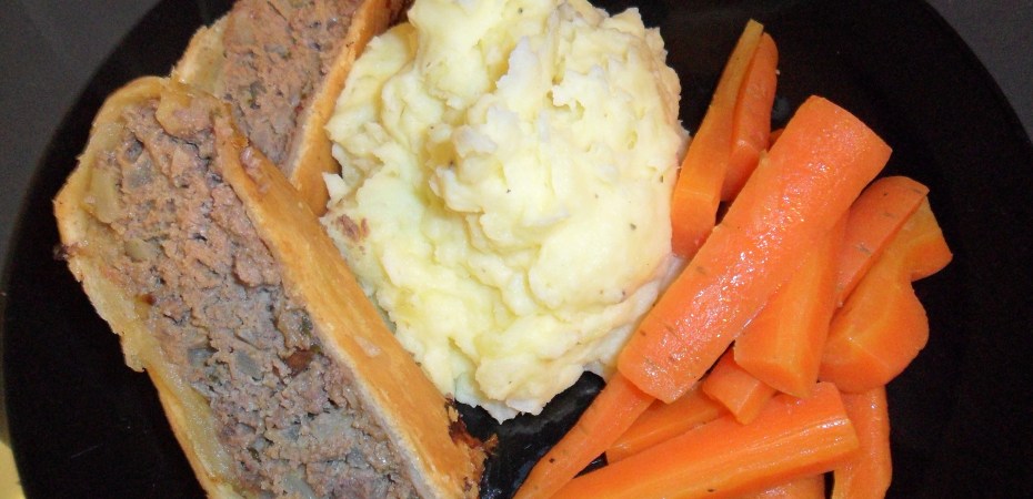 This has been adapted from a recipe that was invented by John Torode’s gran as beef wellington wasn’t a viable option – and, like her, I cant afford to be buying beef fillets to make beef wellington, so meatloaf is a great substitute at only £2.57 per portion. It also happens to be extremely tasty. I just made a couple of minor changes to the original recipe: sitting the loaf on pate rather than mushrooms and substituting the sage with rosemary.
