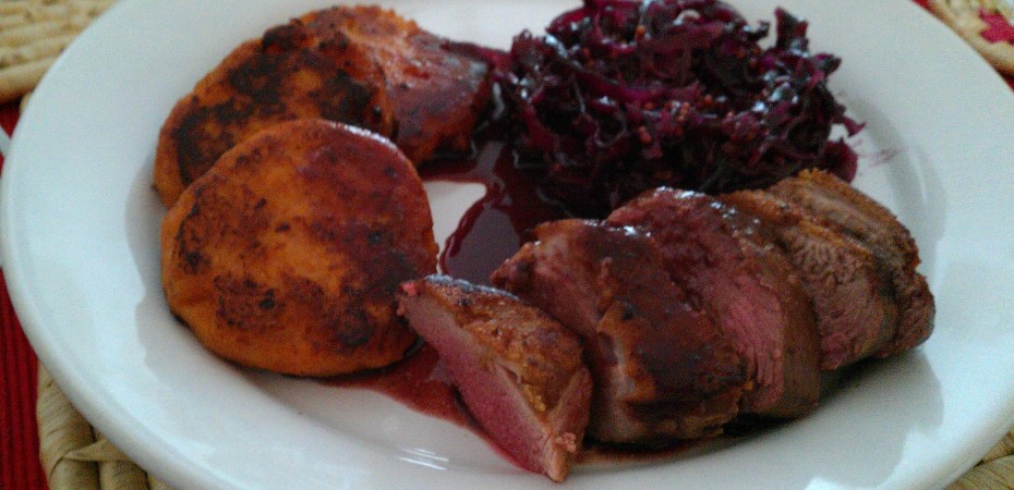 I served these with sweet potato cakes, braised red cabbage and a red wine jus. As much as I loved the duck, the revelation of the day was the sweet potato cakes. I’d never made those before either and they were bloody lovely!