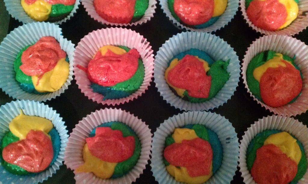 All you need to do now is simply layer the colours in the fairy cake cases until about 1/2 full. I didn’t worry about being too precise – I just splodged it in – but don’t mix it, otherwise the colours will blend together.