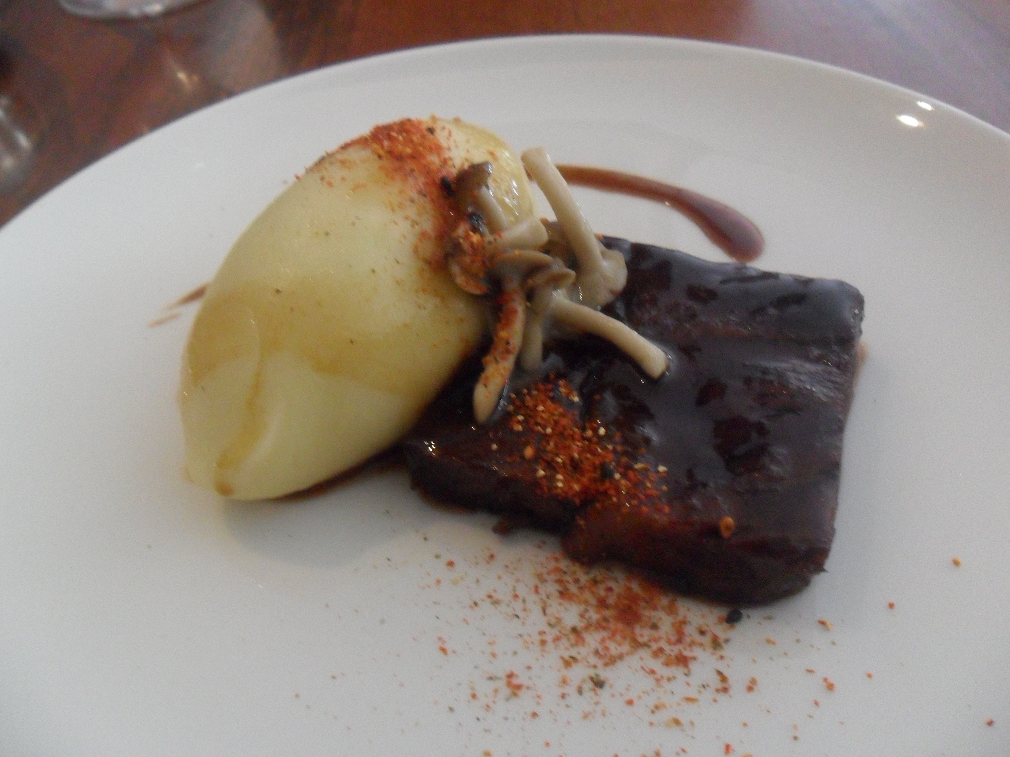 Braised beef feather blade, pomme purée, shimeji mushroom, togarashi spice