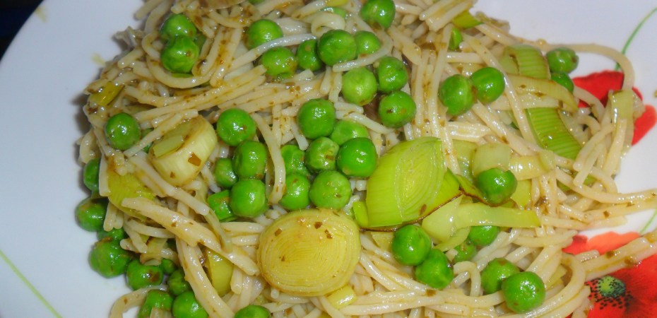 - Cook the spaghetti according to pack instructions, adding the peas for the final 2 mins. Meanwhile, heat the oil in a frying pan, add the leeks, then gently cook for about 5 mins until softened. Stir in the pesto and 3 tbsp of the pasta cooking water, then simmer for a few mins.