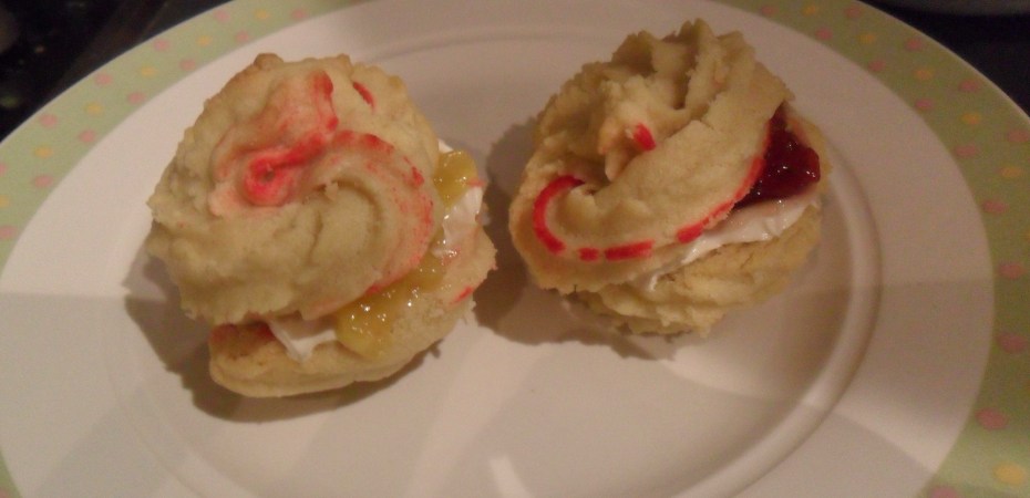 - To assemble, spread a little jam/lemon curd on the bases of half the biscuits. Pipe small swirls of the filling onto the bases of the remaining biscuits and sandwich pairs together.