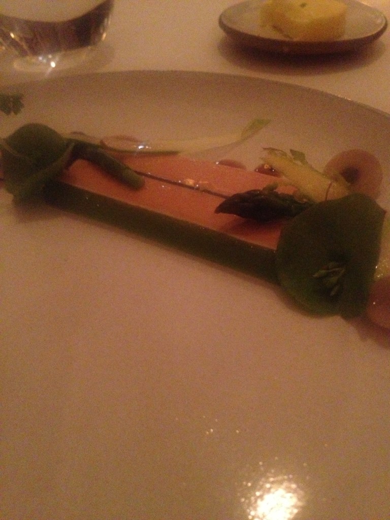 We were then served some bread with a duck fat butter, which was very tasty. A foie gras terrine arrived a couple of minutes later, with truffle cream and asparagus jelly. Now, I don’t eat foie gras for moral reasons and think that it’s a very controversial thing to serve someone who hasn’t asked for it. This has happened to me before in another restaurant and I’ve refused to eat it. However, the waitress did, at the start of the meal, ask us if there was anything we didn’t eat and I completely forgot to say that I don’t eat foie gras, so it’s really my own fault. Being so delighted to have something in front of me that wasn’t a clam, I admit that I wolfed it down. I bloody love liver and shamefully for me, this was probably my favourite course.