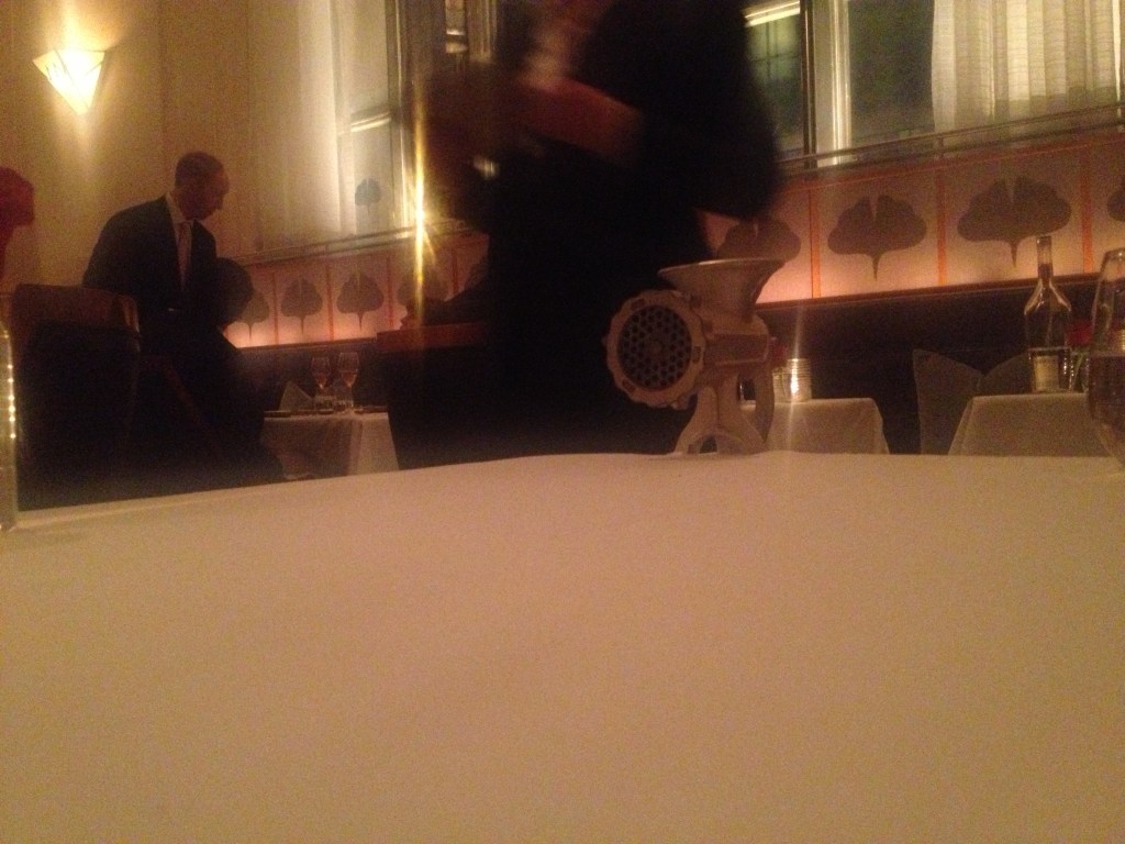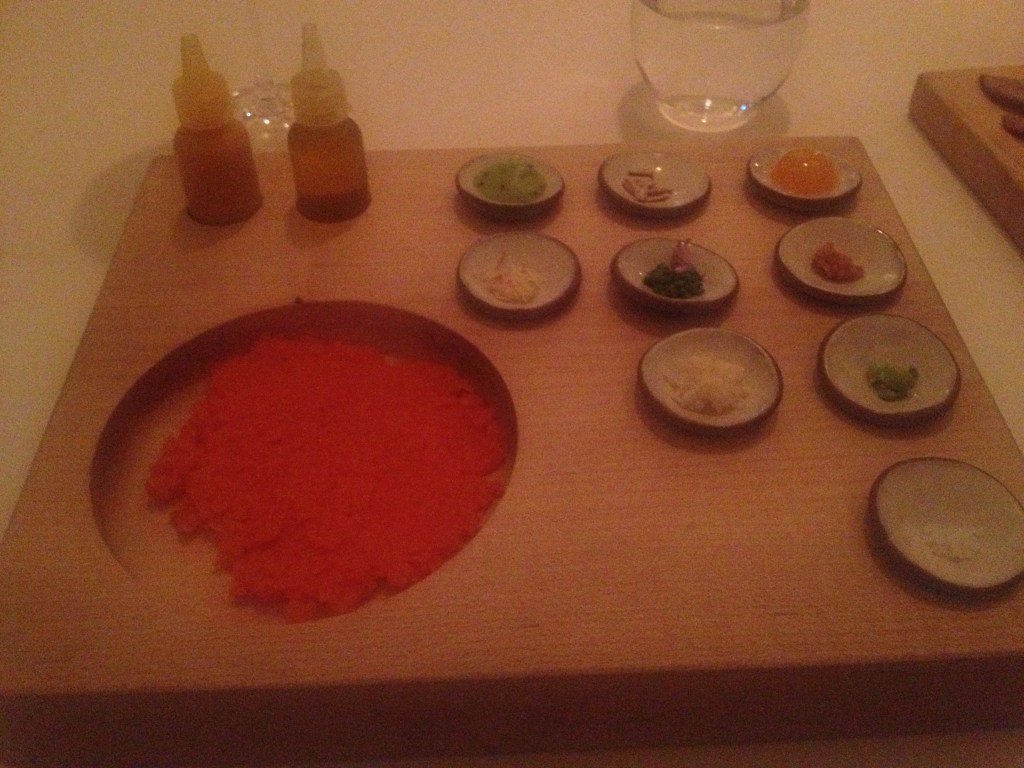 Next, a waiter came and attached a grinder to our table. Great, I thought, we’re having some kind of tartare, possibly tuna, or steak. Imagine my excitement when he brought out a couple of carrots and began to grind them at the table. He then smeared some on a board of condiments, told us to mix it all together and enjoy it.