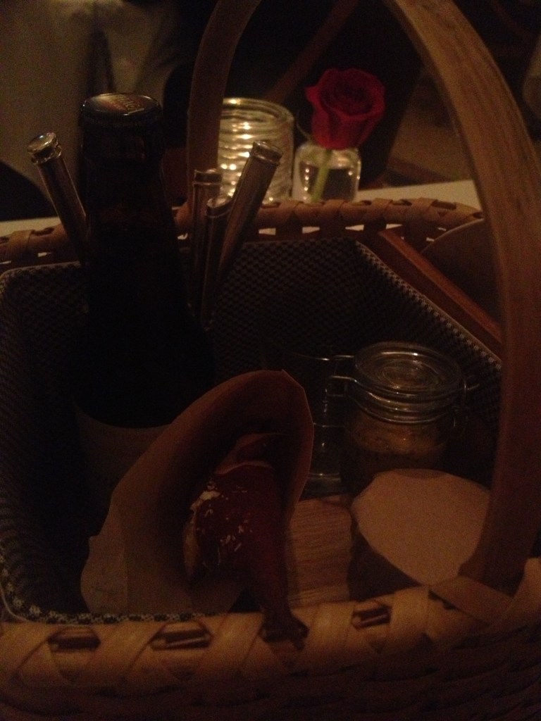 Next was the cheese course, served in a basket. I thought this presentation was quite fun as you had to unpack and lay it all out yourself. I was disappointed to find only one type of cheese, which was a strong flavoured, but tasty brie (I assume – could have been camembert). With that, we got pretzel bread and pale wheat ale to wash it down with.