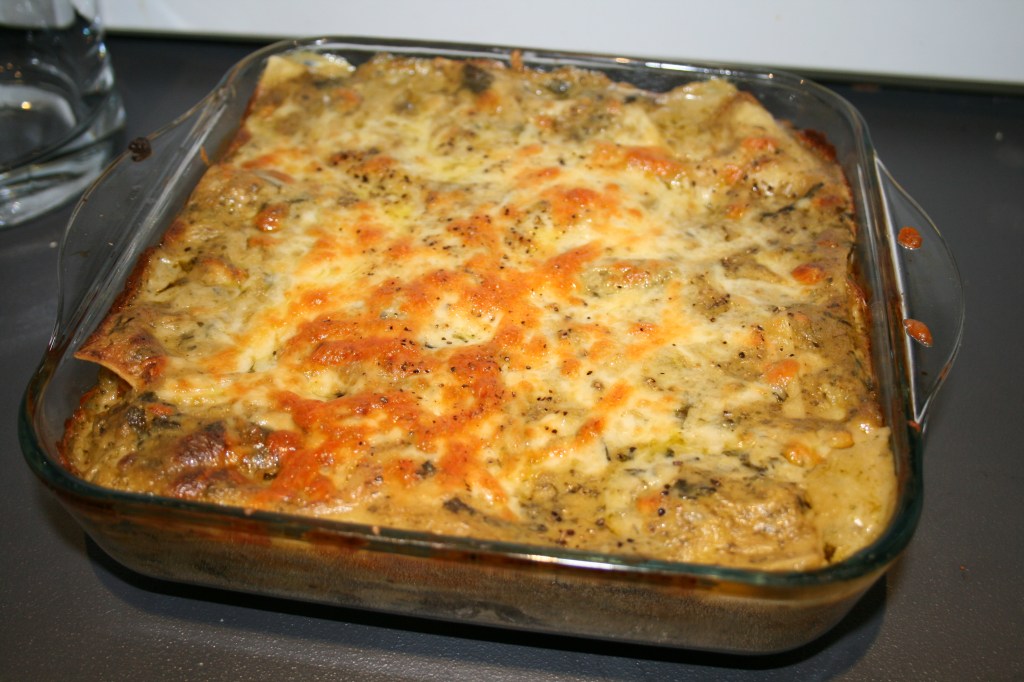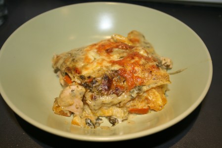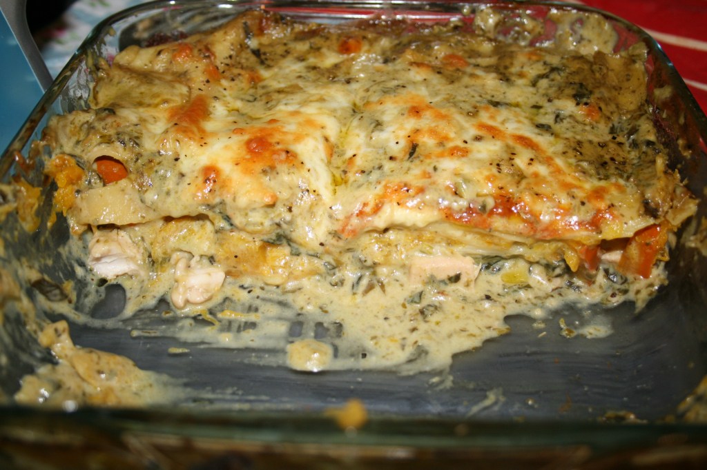 This lasagne is obviously not a classic recipe. Instead of layers of meat ragu and bechamel, the pasta is instead layered with chicken, squash and pesto. You really have to be a fan of pesto to like this dish – it just so happens that I am, so that’s fine.