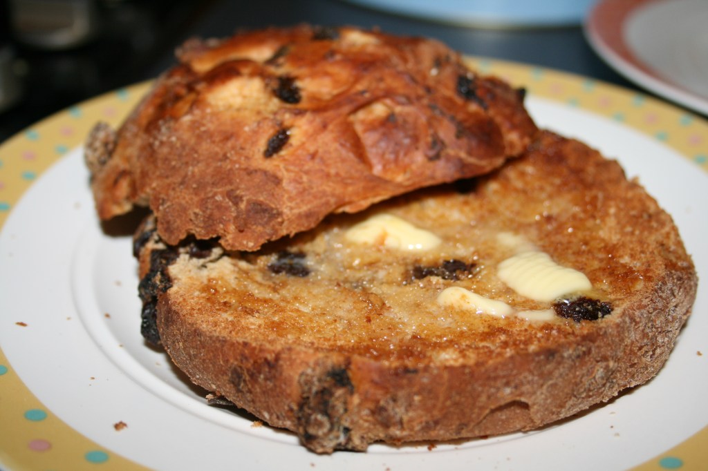 3. Flour 2 large flat baking trays, knock all the air out of your dough and add the soaked fruit (drain the fruit first if you have any liquid left in the bowl). Knead the fruit into the dough until well distributed – you may need to add a little extra flour if the fruit makes the dough too sticky. Break into 6 pieces and shape into balls. Place on the floured baking trays, well spaced apart, and squash each down lightly with the palm of your hand. Cover loosely with oiled cling film, then leave to prove for 30 mins-1 hr, until doubled in size.