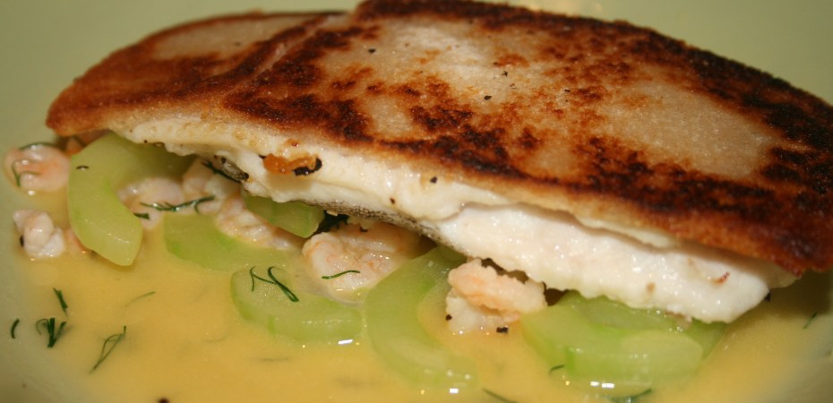 Heston Blumenthal’s Crispy lemon sole with potted shrimps and cucumber