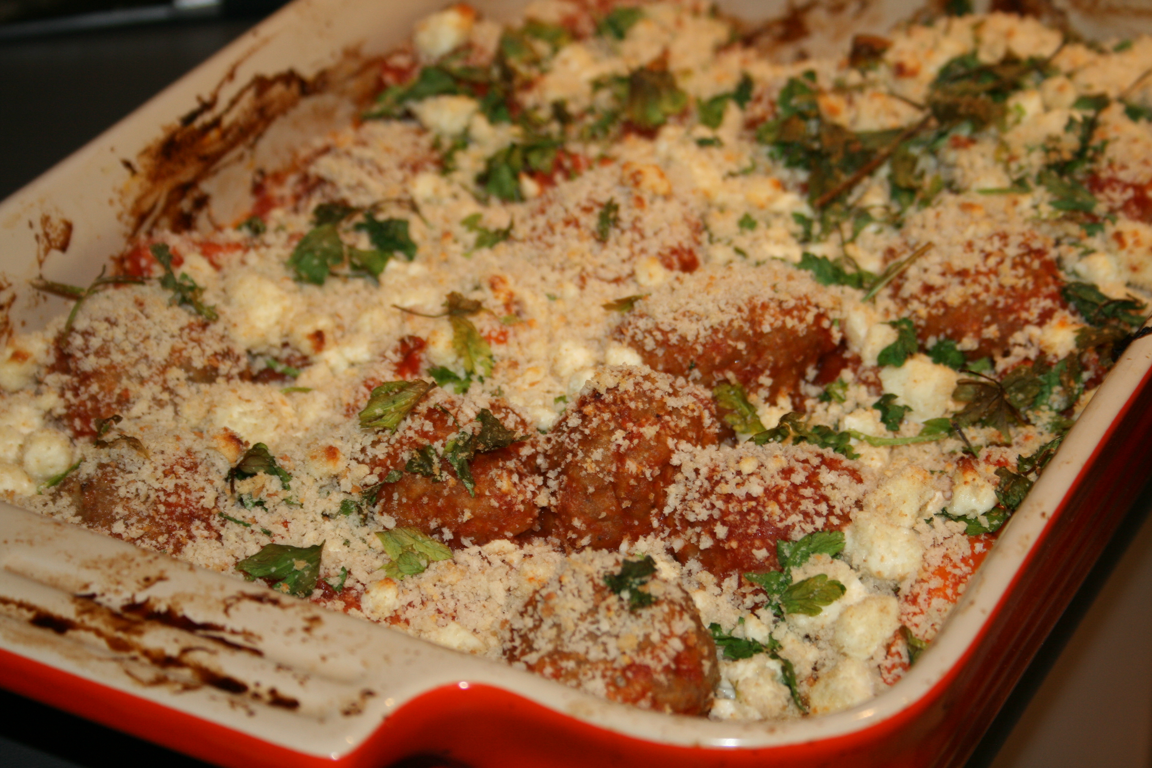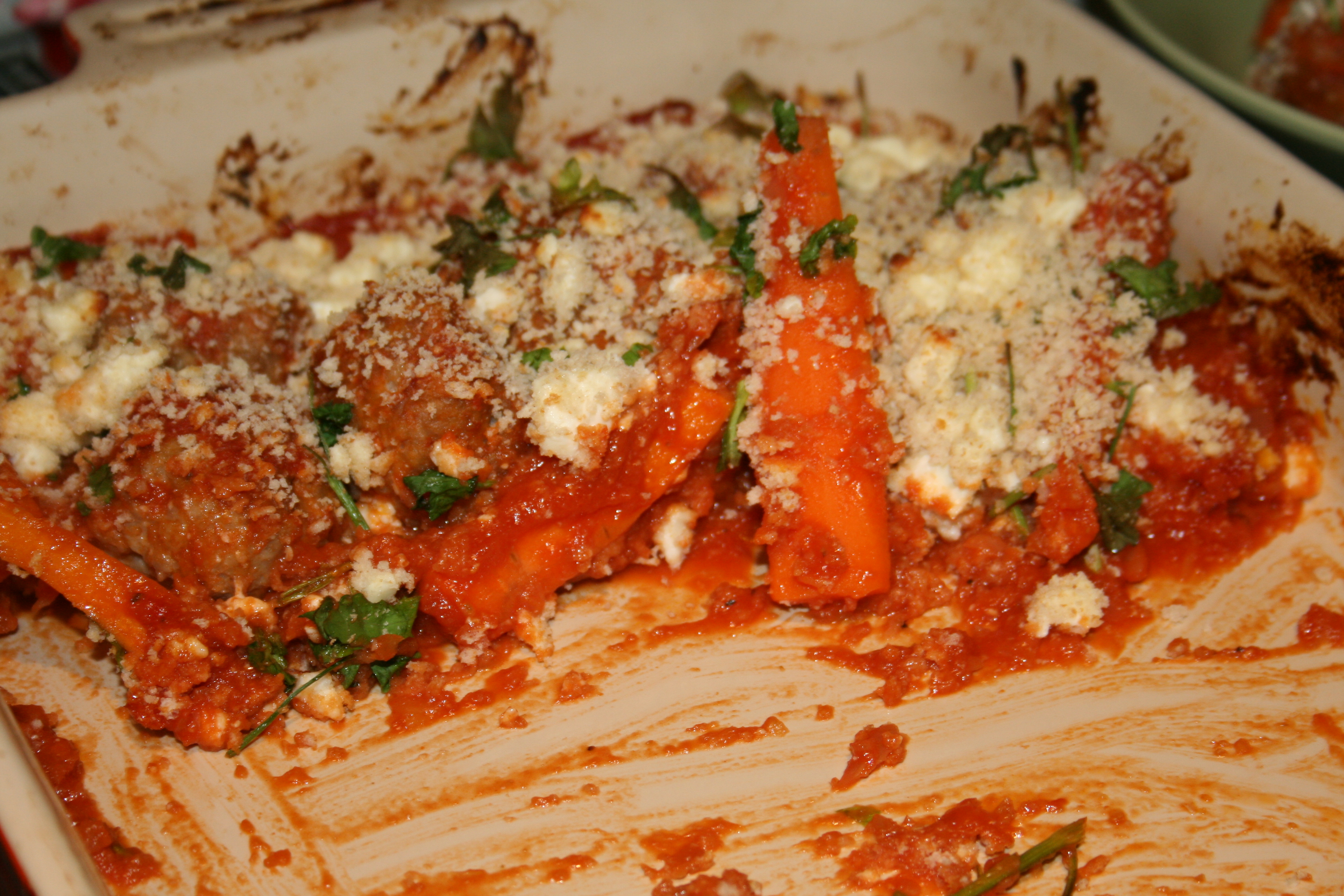 - Divide the meatballs and carrots between baking dishes or tins and spoon over the tomato sauce. Mix the remaining breadcrumbs with the feta, parsley and some seasoning. Set aside any portions for freezing now, and sprinkle feta crumbs over any portions to be cooked immediately.