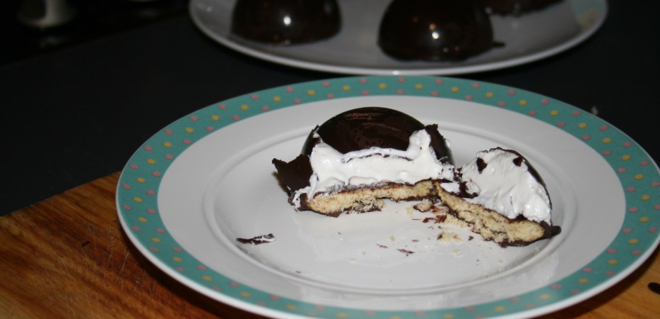 However, it is also used to describe a chocolate dome, filled with marshmallow with a biscuit base.