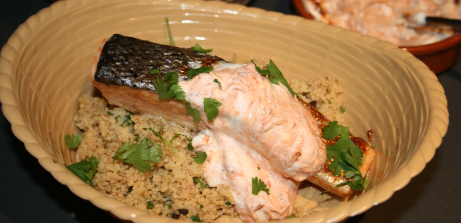 The key to this dish is getting the yoghurt dressing right and also getting a crispy skin on your salmon, which is acheived by cooking the salmon in a hot pan skin side down for 3/4 of the cooking time, without moving it around the pan or putting under a hot grill.
