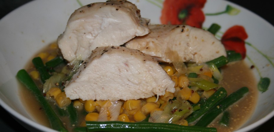 - Meanwhile, heat the chicken stock in a pan until simmering. Add the sweetcorn kernels and green beans, simmer until tender, then remove with a slotted spoon and divide among two warmed dishes (leave the pan on the heat). Add a splash of cream and the wholegrain mustard to the stock, then bubble to thicken slightly. Season to taste.