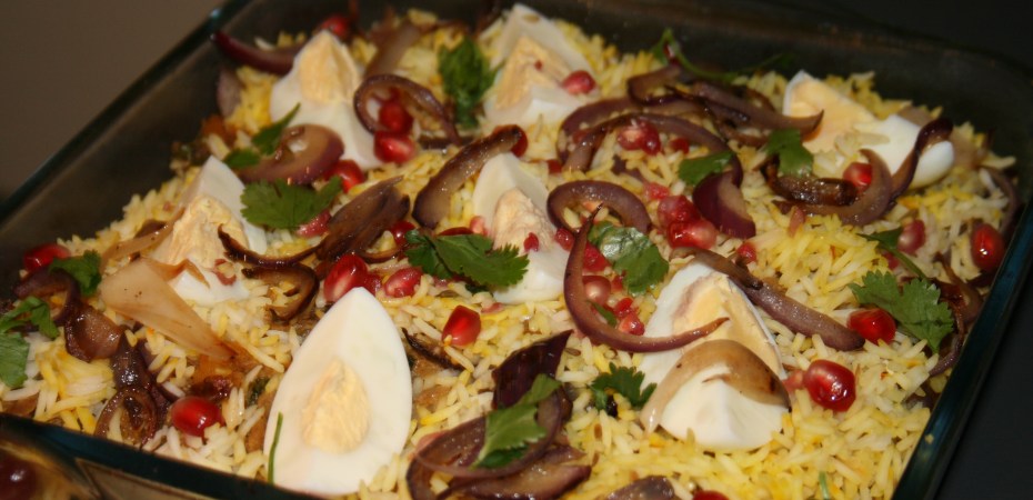 - Cover with a layer of greased tinfoil then top with a snug fitting lid to ensure the steam doesn’t escape. Bake for 30 min, then garnish with the eggs, pomegranate seeds, the remaining onions and some chopped coriander.