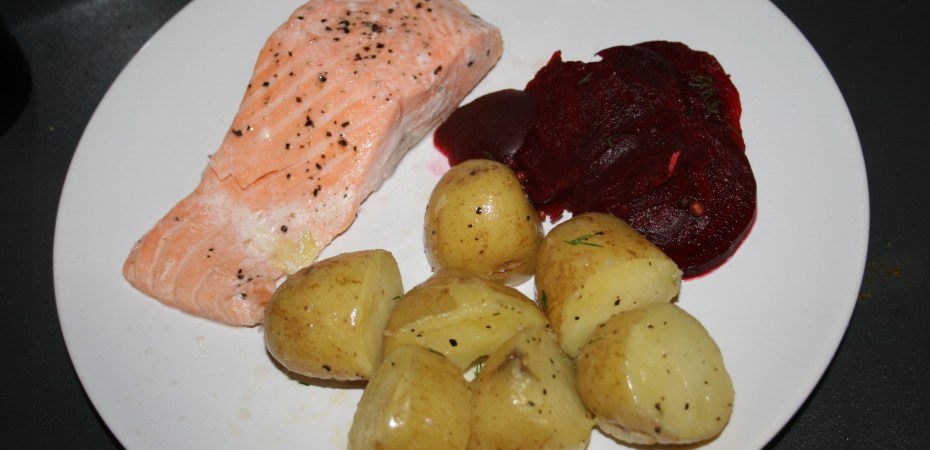 OK, so I accept that initially this dish might look a little….noninspired, or even boring. It’s just salmon, beetroot and some potatoes. There aren’t many ingredients in this recipe, but they all pack a punch with ginger, dill and the pickled beetroot providing loads of flavour.