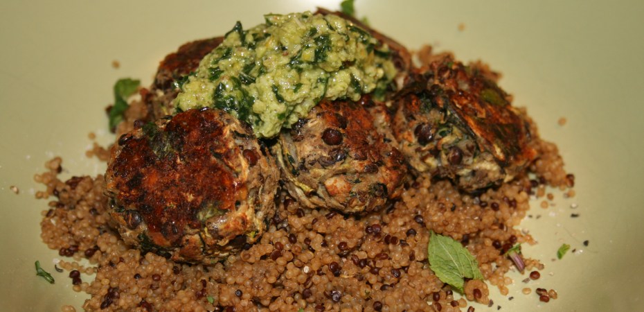 - Take the polpette out of the oven and serve over quinoa with the pesto and the rest of the mint leaves.