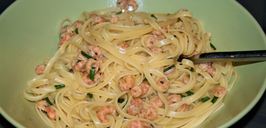 - Stir the pasta and the reserved cooking water through the shrimp mixture. Cook over a low heat for a minute or so to combine the flavours. Finely chop and scatter over the chives, then taste and add more lemon juice if you think it needs it.