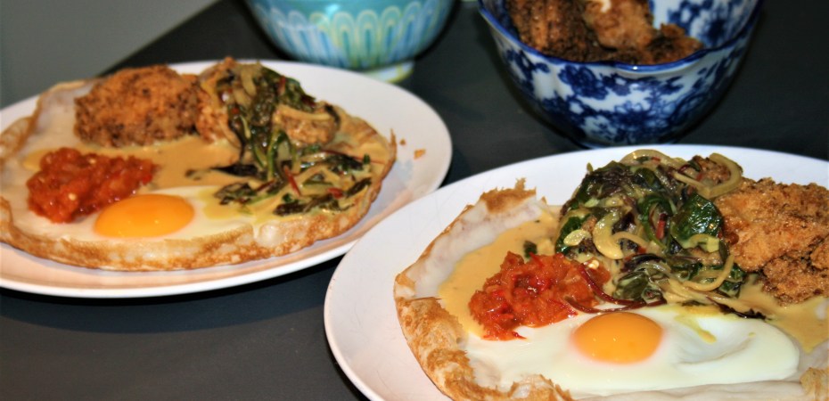 - Make the hoppers. Whisk your hoppers base to remove any lumps. Add a splash more water to thin it if needed. Heat a non-stick frying pan, a hopper pan or small high-sided wok and brush on some rapeseed oil with kitchen paper. Add a ladle of mix to the pan and immediately swirl it around and up the edges to create a bowl-shaped pancake. Cook for 1 min, then add an egg and cover with a lid. Cook for 2-3 mins more until the egg is cooked and the edges are starting to brown. Repeat with the remaining batter and eggs. Serve the hoppers with the chicken, sambol and kiri hodi.