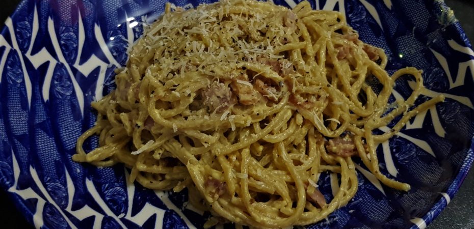 This is a lovely, comforting pasta dish with a base of cheese sauce made with ale. It’s a mash-up of welsh rarebit and spaghetti carbonara and is definitely a new regular weeknight dinner in our house.