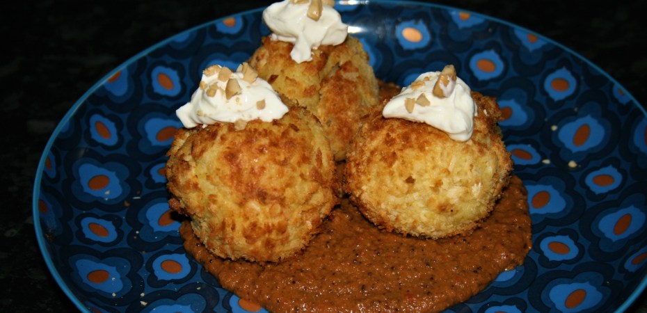 This is essentially crispy potato dumplings filled with spiced paneer cheese, on a mild curry sauce.