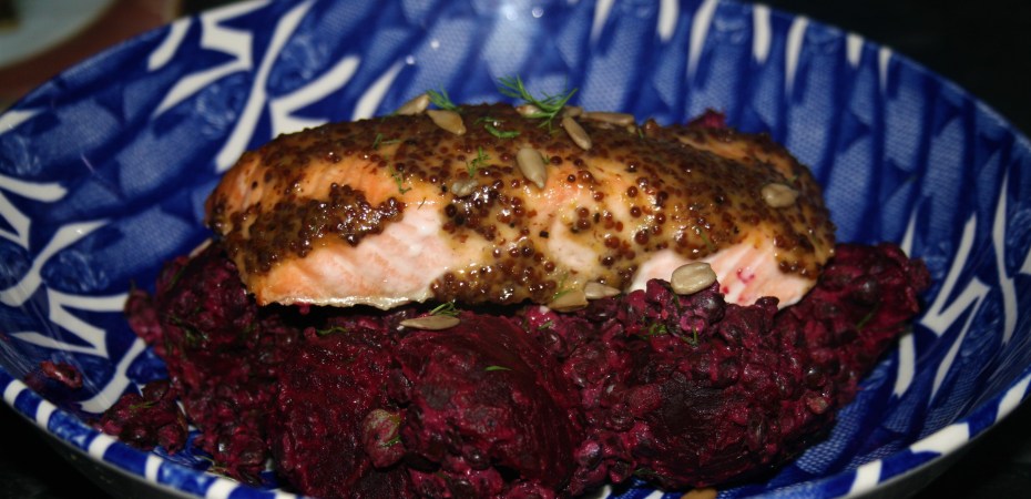- Heat oven to 200C/180C fan/gas 6. Mix together 1 tbsp oil, the mustard, honey and some seasoning. Put the salmon fillets on a baking tray and spread the honey and mustard mixture all over. Tip the lentils and beetroot into a casserole dish, toss with the remaining oil and season well. Put both in the oven for 10 mins until the salmon is cooked through.