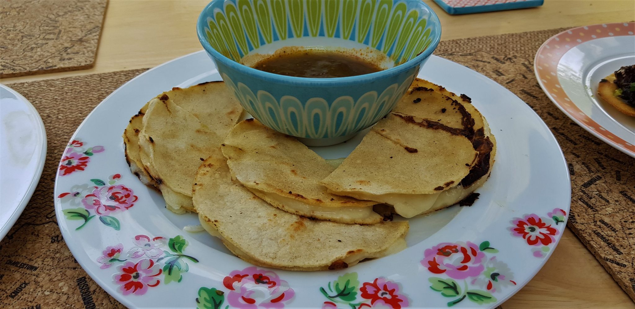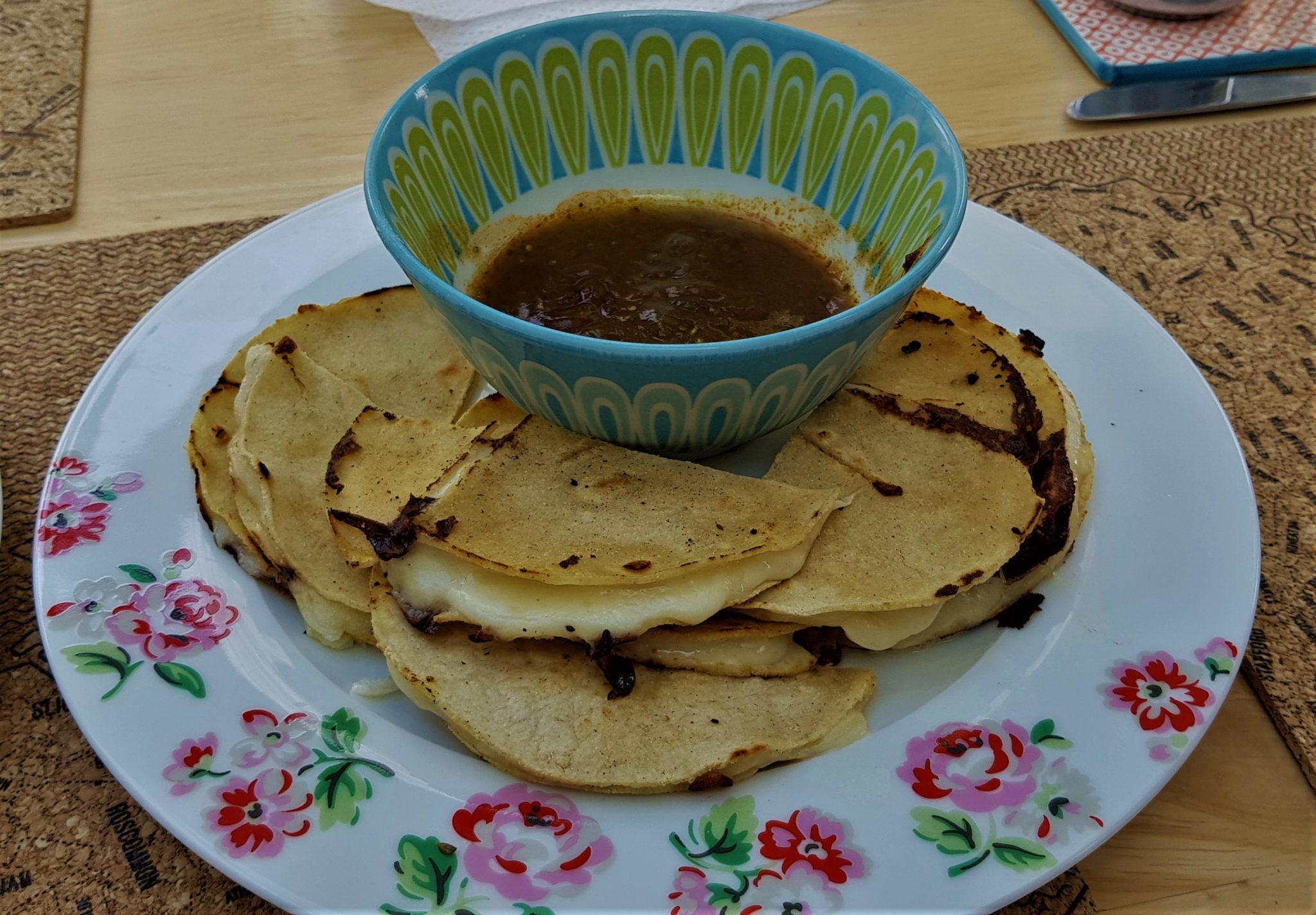- Put one tortilla on a hot comal, flat griddle pan or frying pan. Liberally sprinkle with cheese, then place another tortilla on top and lightly brush with some softened butter. Turn over once and, when the cheese has melted, cut the quesadilla in half and sprinkle with sea salt. Repeat with the remaining ingredients. Serve with the salsa.