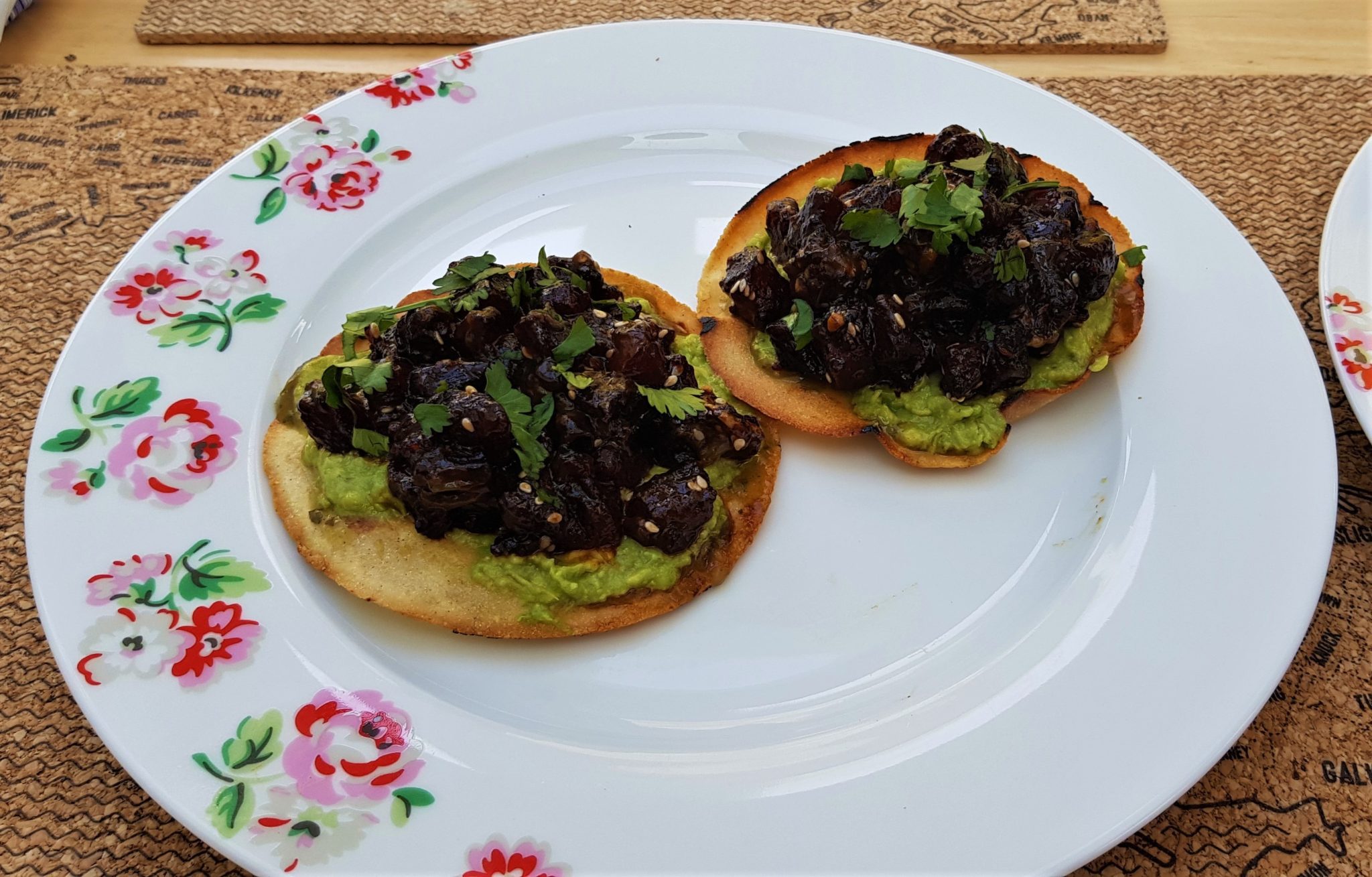 - Cut the tuna into small cubes and keep chilled. Mix the soy with the sesame oil, most of the sesame seeds and the chipotle paste. Add the tuna in and mix well.