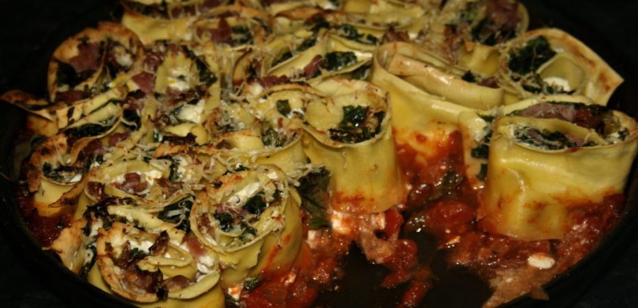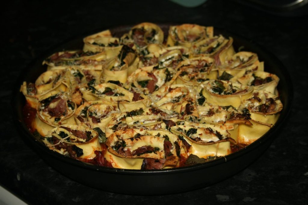I had never heard of rotolo until recently but it is essentially a pasta swiss roll! Ingredients are spread onto a sheet of pasta and then rolled into a spiral, before being sliced and baked.