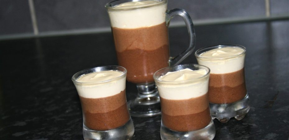 - For the dark chocolate layer, melt the chocolate and sugar in a heatproof bowl set over a pan of barely simmering water, making sure the water doesn’t touch the bowl. Take off the heat, then stir in the egg yolks. In a clean, dry bowl, whisk the egg whites to firm peaks, then fold into the chocolate mixture. Divide among 20 shot glasses, then leave to set in the fridge.
