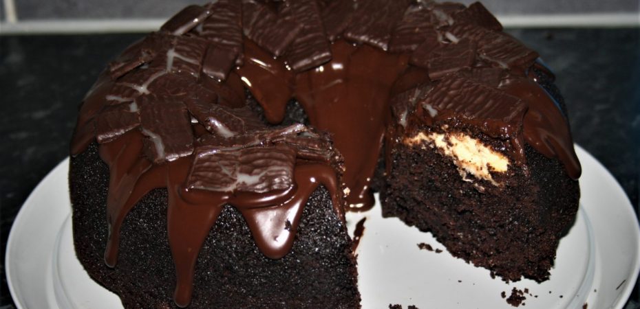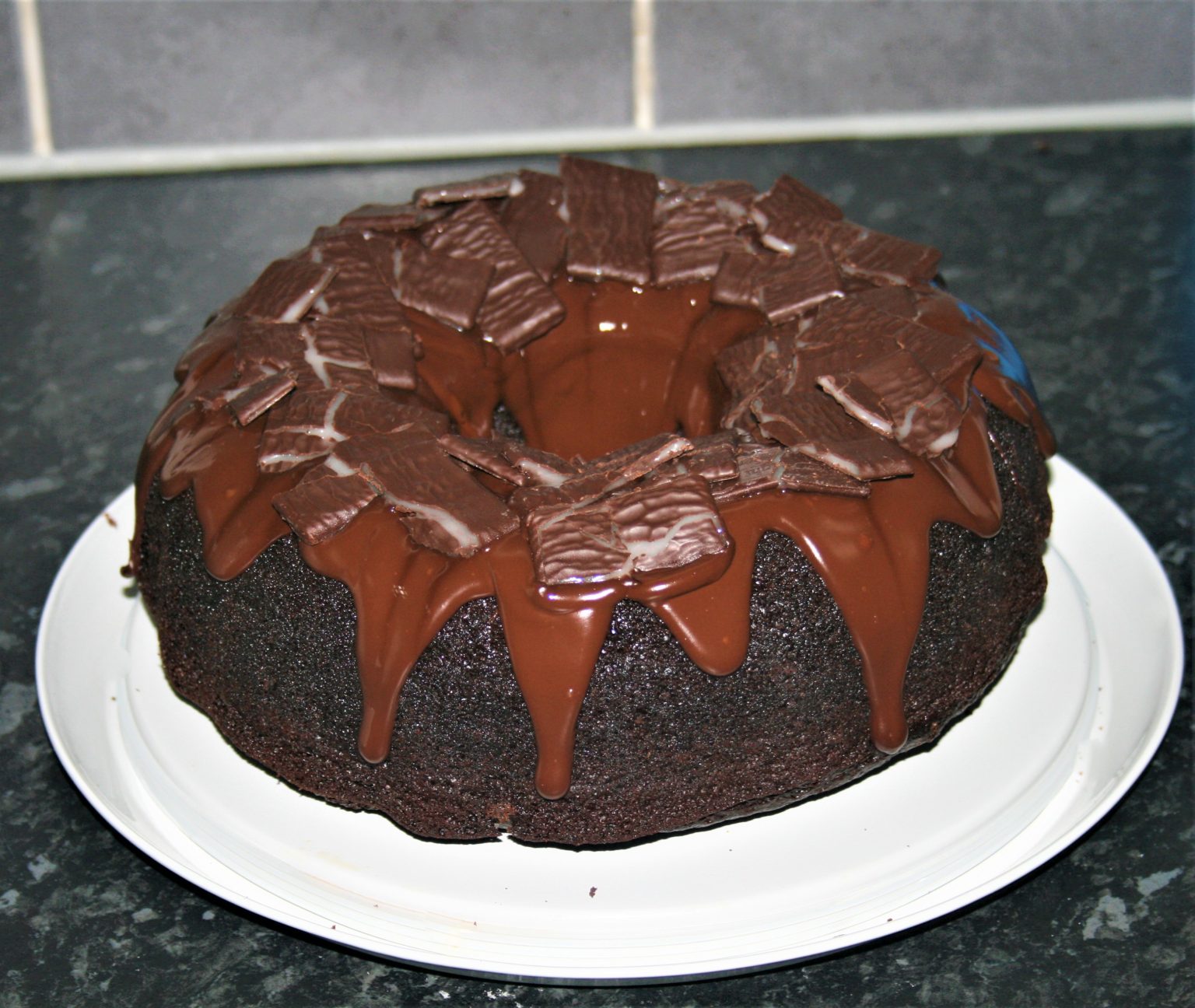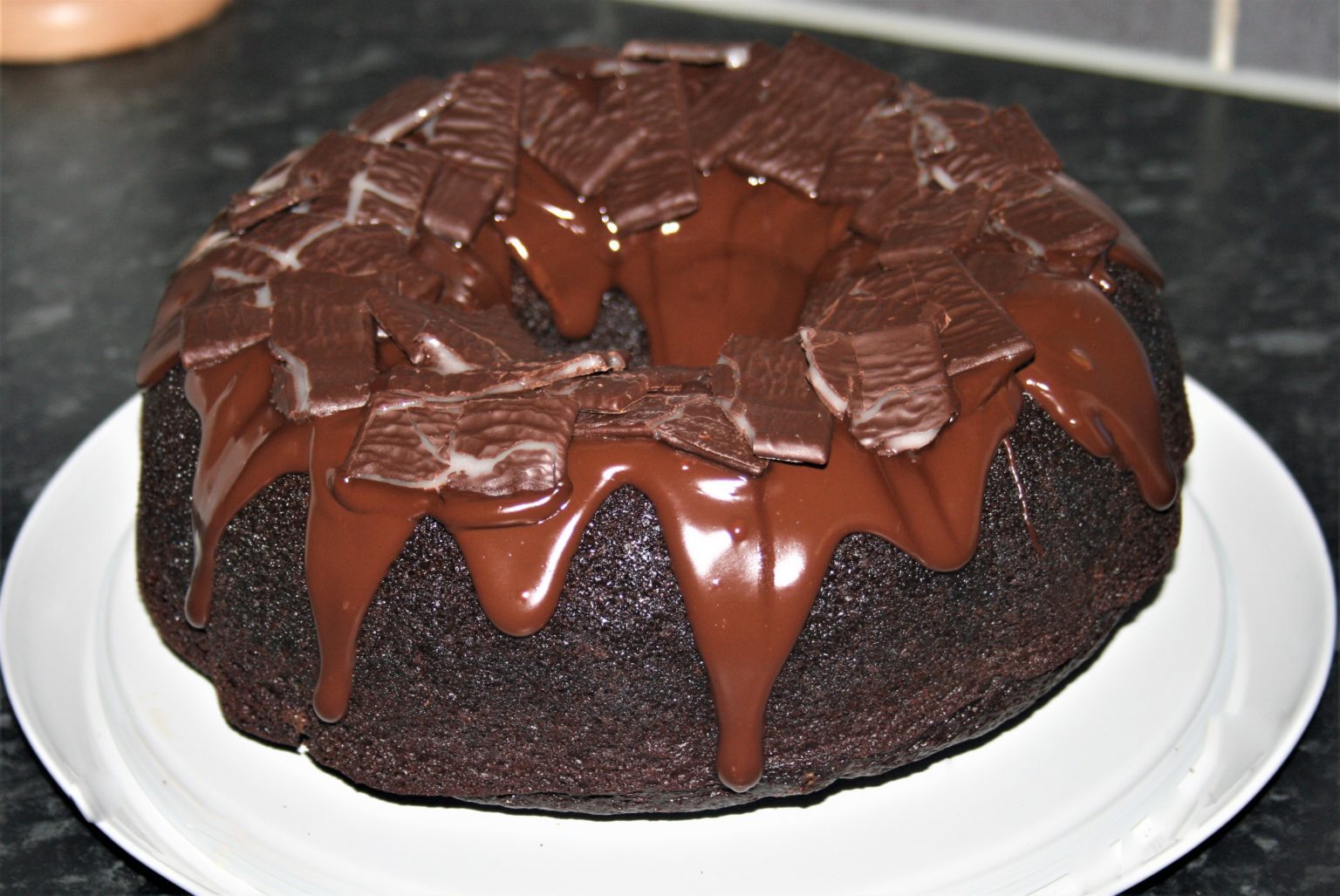 - To make the glaze, put the cream into a small pan and bring to a simmer. Meanwhile, put the dark chocolate, golden syrup and peppermint extract in a bowl and, once the cream is simmering, pour over the chocolate and put aside for 2 minutes before stirring to form a silky-smooth ganache. Leave for 5 minutes to thicken slightly before pouring the ganache all over the cake, allowing it to drip down the sides. To decorate, break the After Eight chocolates into small pieces and scatter over the top of the cake. The cake will keep for 3-4 days in a sealed container.