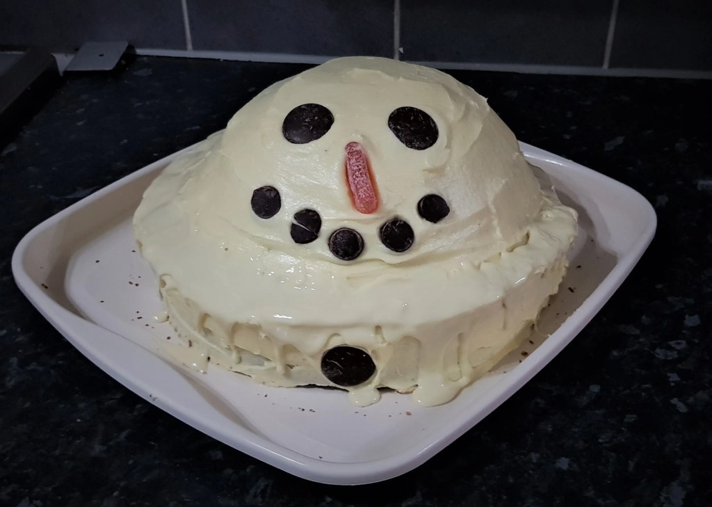 So when I saw this cake I was glad that finally there was something that was supposed to be a little more slapdash – I mean, ‘rustic’. The snowman is melting, so he’s clearly not going to be looking his best. And he definitely does not. But I had great fun making it, which is the main thing and the fact that it doesn’t need to look perfect means it could be a great Christmas project for the kids to get involved with.