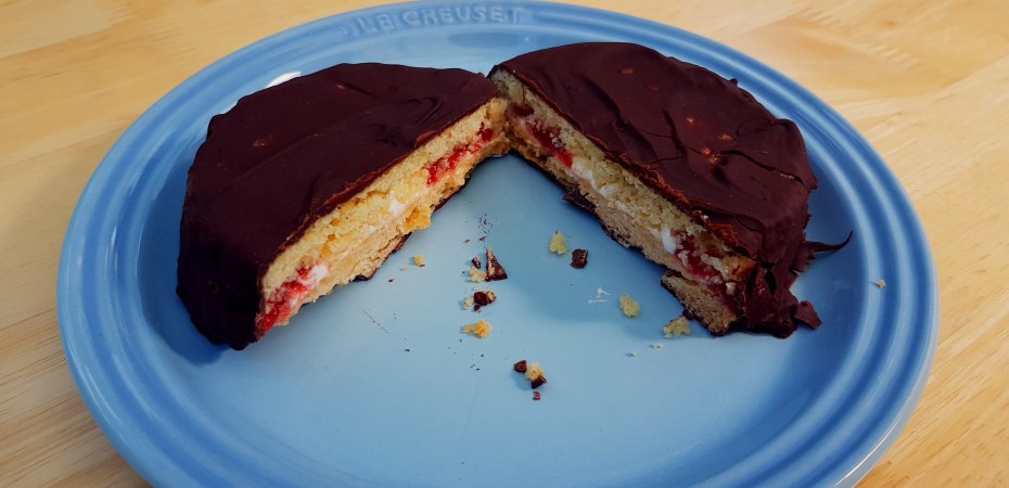 A wagon wheel is a classic british sandwich biscuit, filled with marshmallow and jam, then coated with chocolate.