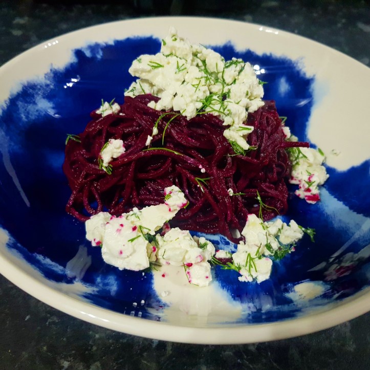 - Once the pasta is cooked to your liking, drain and put back into the pan. Pour in all that beautiful beetroot sauce and mix through. Tip out on to a serving dish and sprinkle over all the feta and dill mixture.