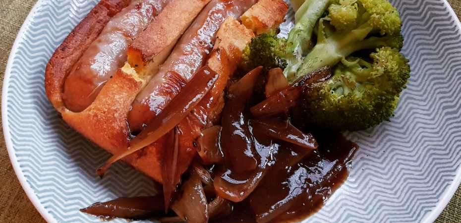 - Heat the oven to 220°C/200°C fan/gas 7. Put the sausages and onions in a 23cm ovenproof frying pan. Season and add a few fresh thyme sprigs and 1 tbsp olive oil. Bake for 10 minutes.