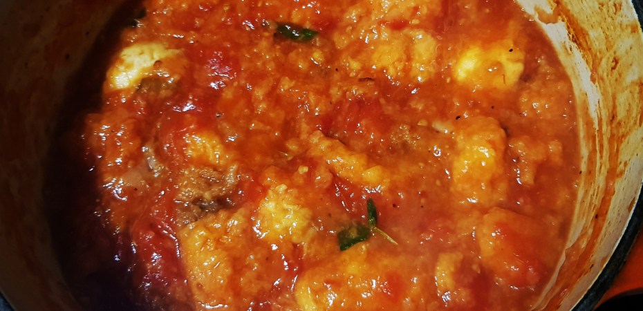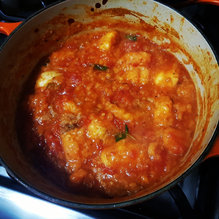 - Before the garlic starts to colour, add the tomatoes and 2 tins’ worth of water, season with sea salt and black pepper, and bring to the boil, gently mashing the tomatoes.