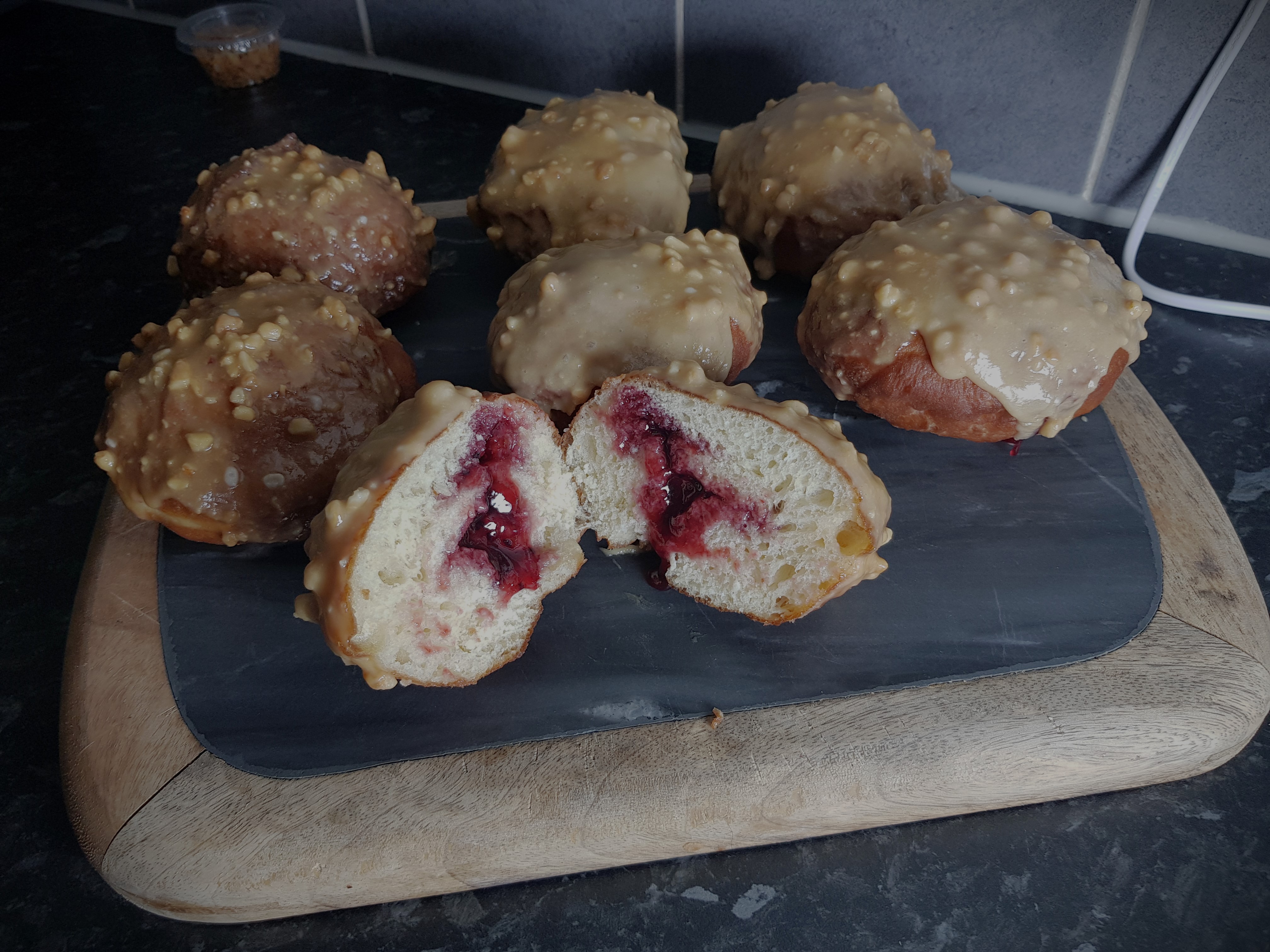 The filling for these is therefore a raspberry jam and I mixed some peanut butter into the icing. I went for crunchy because that’s what I had in my cupboard, but smooth peanut butter would probably work a little better. The dough is lovely; super soft and pillowy and I was quite impressed with myself that they all seemed to have the right amount of jam in them! You do need the right equipment for this; so either a piping bag with a hard nozzle (which is what I used) or a syringe.