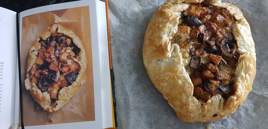 Pastry is my favourite carb, so never need much persuading to make a pie or tart. This one, for a freeform tart is also quite rustic in presentation, so suits my style of cooking perfectly. I don’t think I did too badly attempting to make it look like the image in the cookbook!
