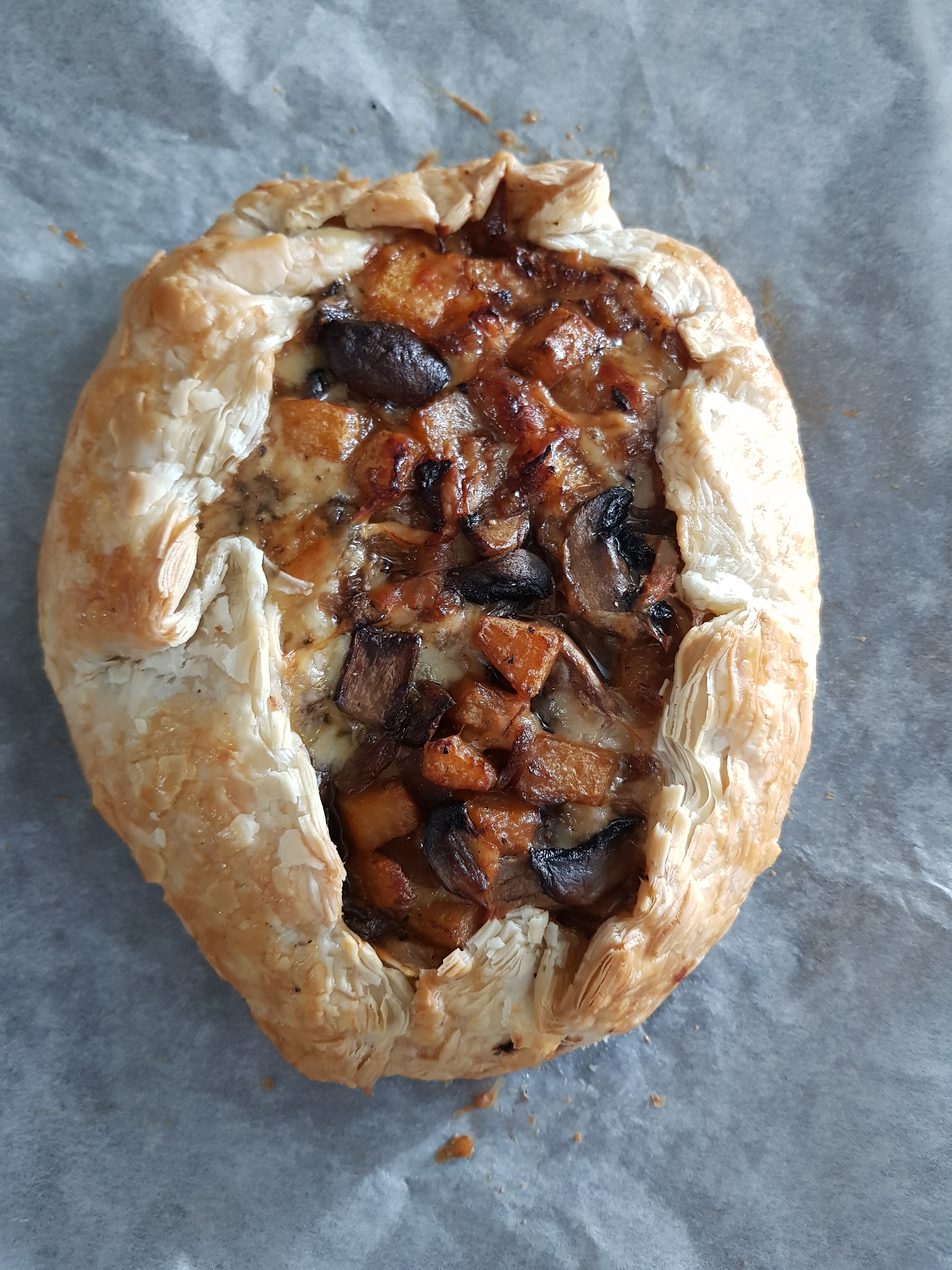 - On the floured board, roll the pastry out into a large, rough-edged circle approximately 30cm in diameter and transfer to a parchment-lined or flour-dusted baking sheet. Pile the filling in the centre of the pastry, leaving a wide gap of bare pastry round the edge. Fold the edges of the pastry over the filling, leaving the middle open. Brush the edges with beaten egg, then place the whole baking sheet on top of the hot sheet or stone in the oven and cook for twenty-five minutes, till the pastry is pale gold and the filling has crisped on top. Leave to settle for ten minutes before slicing.