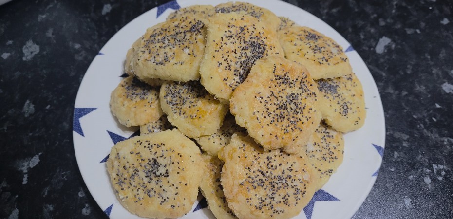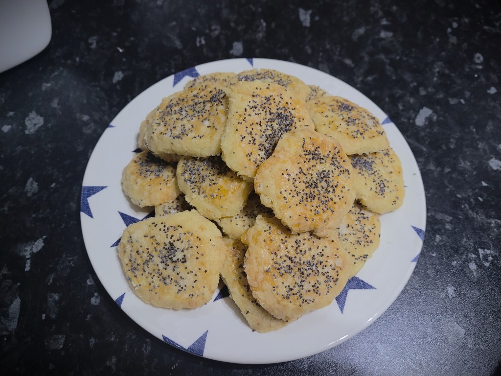 Heat the oven to 180°C/ 160°C fan/gas 4. Slice the dough into 5mm rounds and place on a lined baking sheet about 3cm apart (the biscuits will spread a little in the oven.) Brush with the beaten egg, then sprinkle with extra sea salt and poppy seeds. Bake for 12 minutes or until golden.