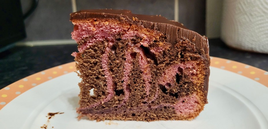 I love a cake with a hidden design in; they’re so impressive to look at, but quite often are very easy to actually make. This cake was a breeze to do as the pattern itself is not that precise and just involves layering the two cake batters in the cake tin.