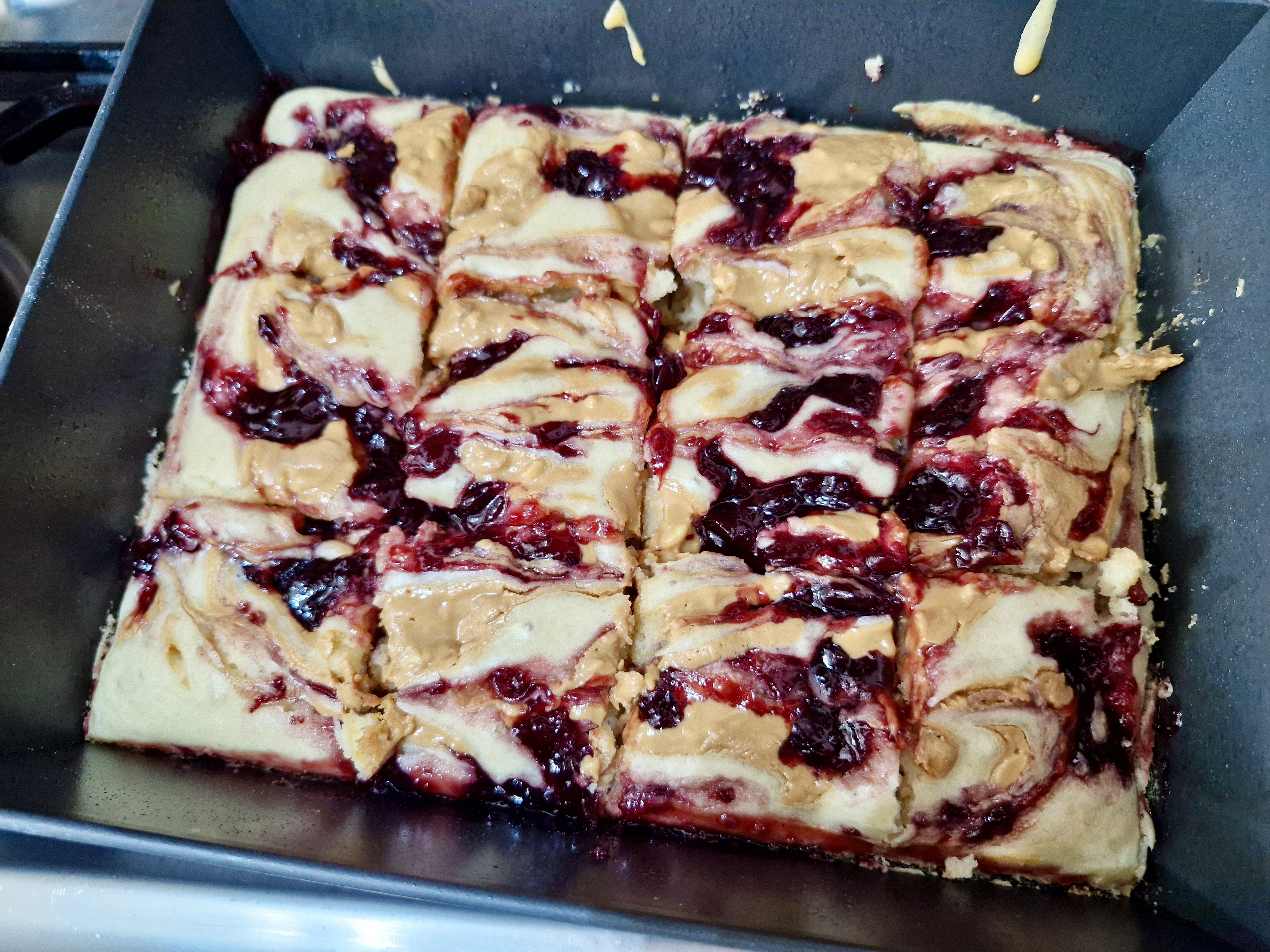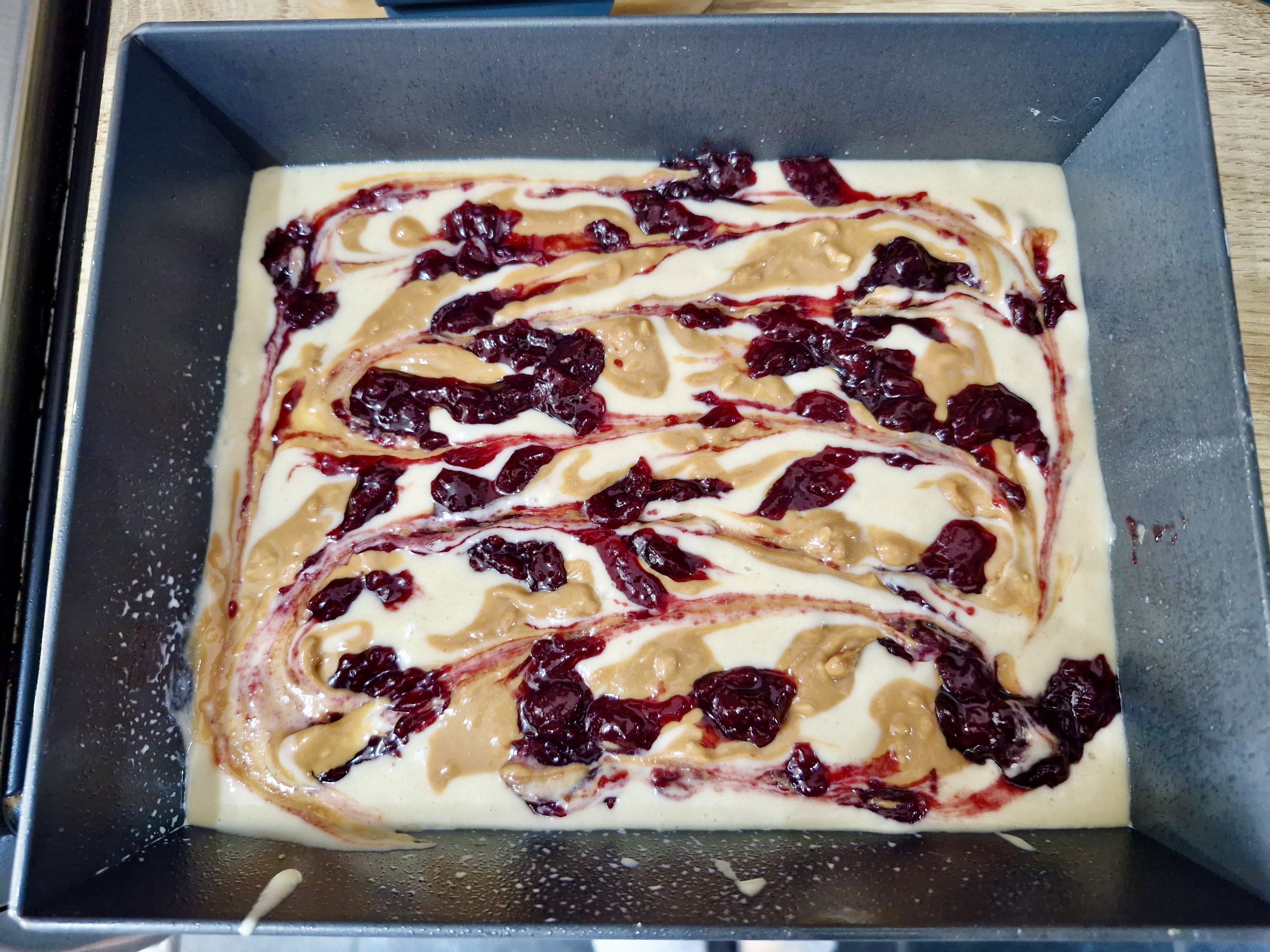 Pour the batter into the prepared brownie tin and spread out evenly. Take dollops of the jam and spoon them in sporadically, then do the same for the peanut butter. With the end of a spoon, swirl the dollops together slightly to create a marbled effect.