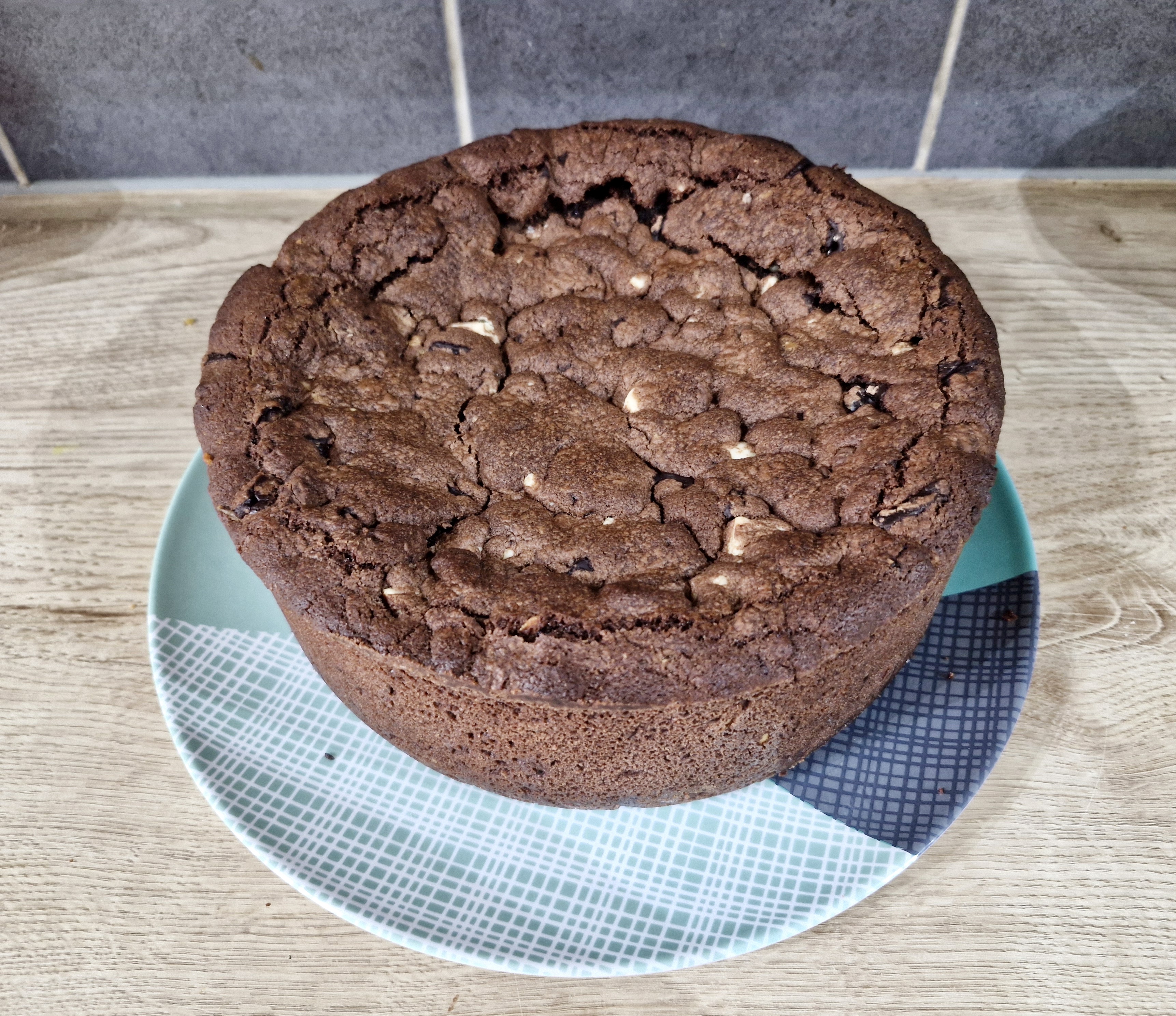 Add the unsalted butter, light brown soft sugar and white granulated sugar to a bowl and beat together until creamy. Add in the egg, egg yolk, and vanilla extract and beat again. Add in the plain flour, cocoa powder, bicarbonate of soda, and salt and beat until a thick cookie dough is formed. Add in the chopped chocolates and beat the cookie dough again until distributed well.