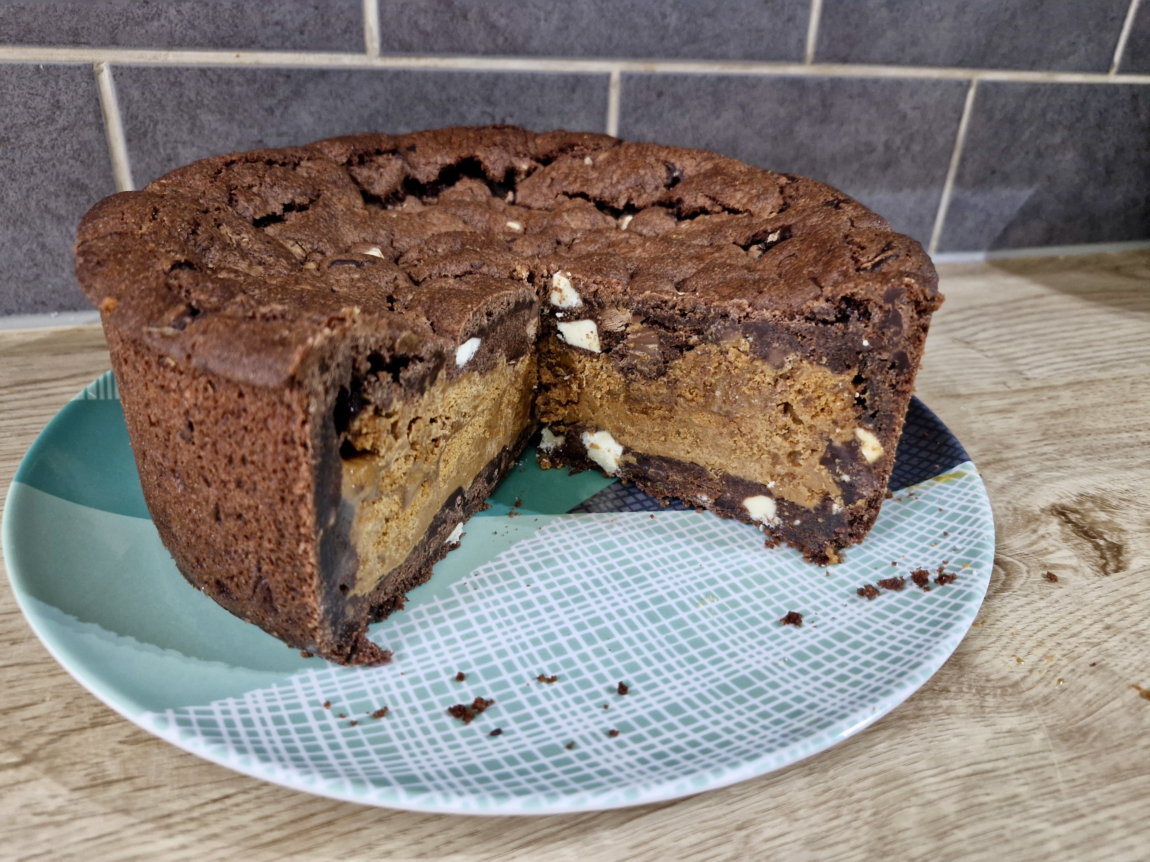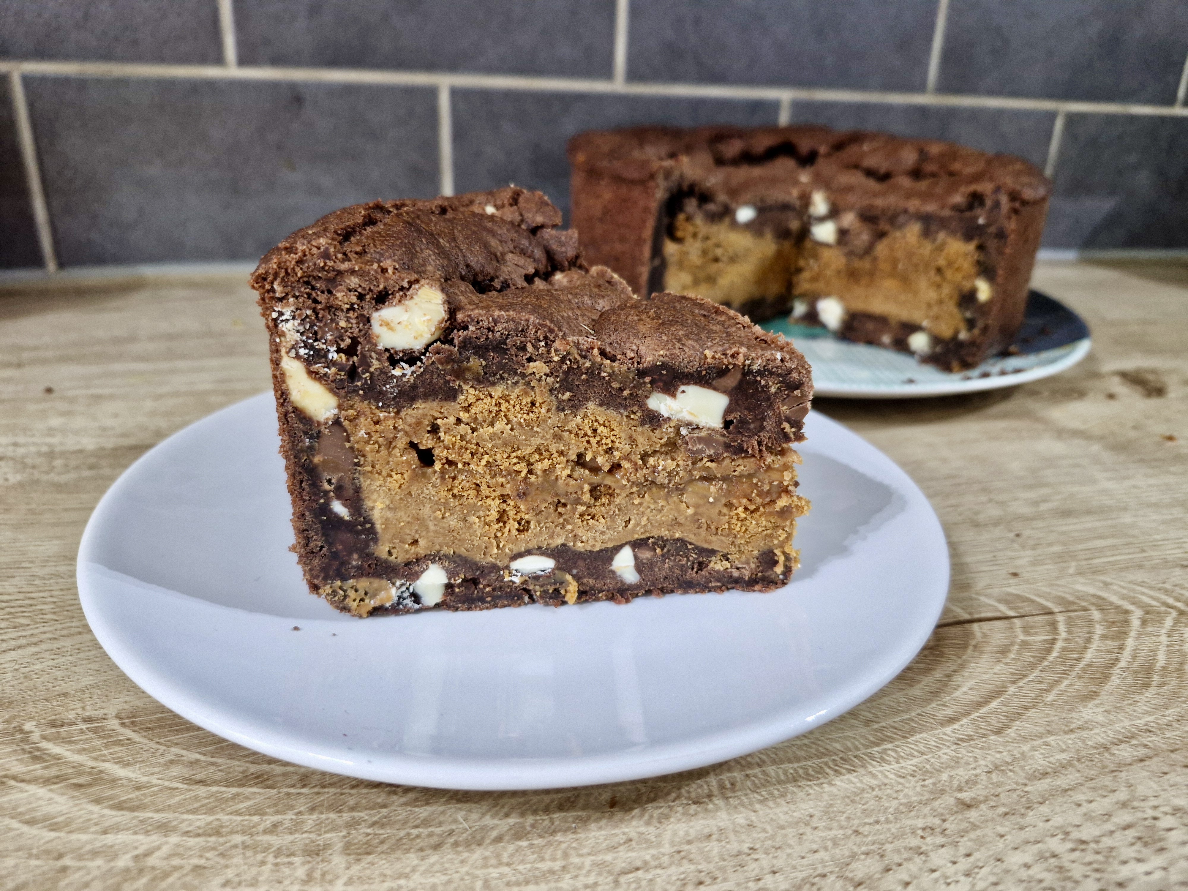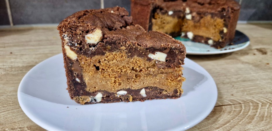 Melt the biscoff spread for 20 seconds in the microave to loosen slightly or mix in a bowl briefly to loosen. Pour half into the cake tin inside the cookie dough case. Add on the chopped biscuits. Pour on the rest of the Biscoff Spread.