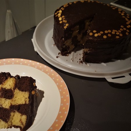 Banana & chocolate bundt cake with peanut caramel drizzle