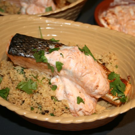Cinnamon rubbed salmon with couscous & harissa yogurt