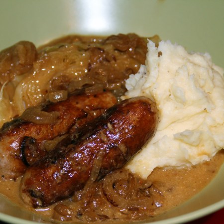 Bangers and mash with braised cabbage and caraway seeds