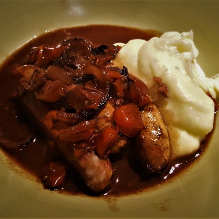 Sausages braised in red wine with fennel