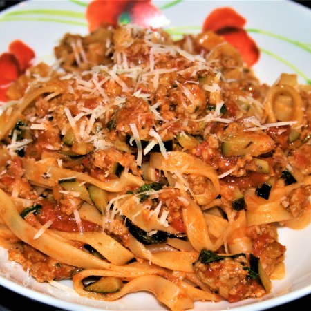 Tagliatelle with sausage ragu, courgette and hazelnuts